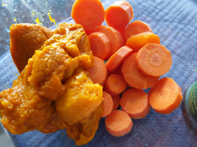 raw carrots with cooked pumpkin, green mush, probiotics, green apple,